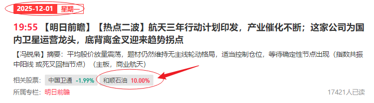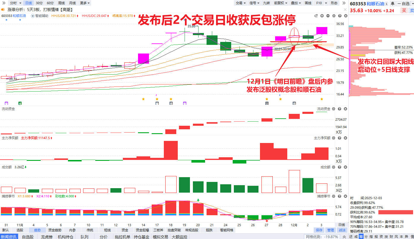 市场缩量回调,恭喜咱们《明日前瞻》栏目依然逆势收肉!周一晚内参提及泛股权概念和顺石油,在接近4000家翻绿的低迷市场中脱颖而出,强势斩获反包涨停,让跟上节奏的朋友再次跑赢市场!