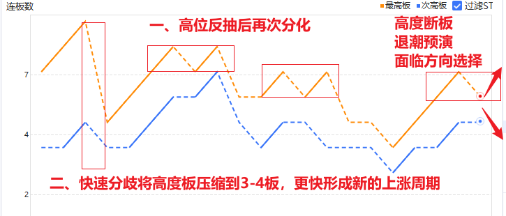 情绪方面,空间板金富科技断板确认周期退潮,后面大概率是两种走法:一是次高活口良性晋级带动中高位反抽修复,经过1-1.5天的短修复后再次分化直至连板高度降低到3-4板;二是次高补跌延续退潮,亏钱效应进一步加大,快速将高度压缩到3-4板,然后形成新的短线上升周期。极小概率中位活口晋级后突破8板压制直接延续上升周期。