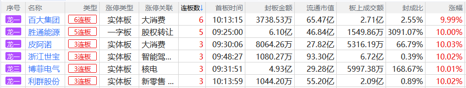 焦点股方面,零售板块百大集团6连板、南京商旅9天5板,实控人变更的胜通能源5连板、皮阿诺4连板,商业航天概念股顺灏股份15天8板,影视股博纳影业9天5板。