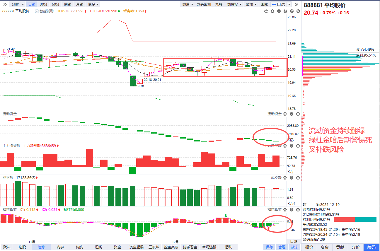 指数角度,平均股价流动资金持续翻绿,捕捞季节绿柱金叉区间的反弹,更多是超跌轮动的反抽,不具备持续性赚钱效应,资金走弱的金叉后期,需要警惕死叉补跌风险,整体仓位控制在2-3成仓,耐心等待分歧释放。
