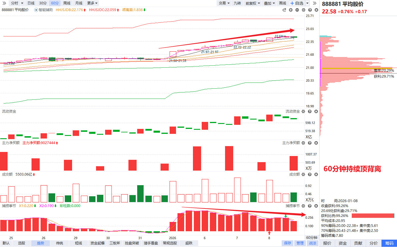 指数角度,上证15连阳,平均股价延续金叉上行,流动资金持续翻红,整体维持良性上行。不过虽然牛市不言顶,但节奏性的潜在分歧也在累积,60分钟波段已经走出三重顶背离,那么短期就只适合持股/灵活T直到指数大分歧再被动减,不适合随便新开或追涨了。