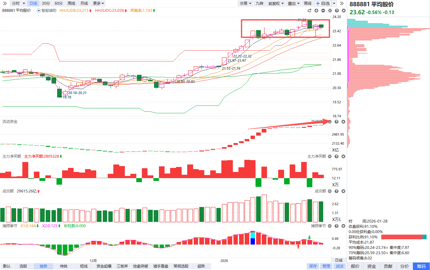 指数角度,平均股价延续死叉震荡,捕捞季节日线、周线死叉,短期波动加大,操作难度进一步增加。不过流动资金连续翻红,量能维持3万亿以上,流动性充足的背景下,行情整体呈现良性轮动,围绕指数横盘箱体可以适当低吸高抛短线做T,仓位控制在5成左右,耐心等待周线回档后再度金叉的主升行情。