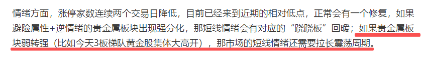 题材方向,今天黄金/有色方向日内高潮,明天看是惯性加速还是开盘分歧了,如果能惯性加速集体大高开(板块大高开,1进2、4进5有批量大单顶一字),就容易高潮转分化,进而给到资金轮动其他题材的空间,有望推动情绪修复和涨停家数进一步回升。如果黄金没能加速(板块平开,4进5集体仅小高开),那就留意黄金板块的急跌低吸,其他方向的轮动预期降低(一般日内最强的方向加速买不到了,资金才会开始买支线轮动)。