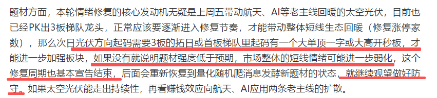 航天方向,补涨的太空光伏强度不过,明天如果炸板的拓日、双良无反包+后排跌破5日线,那基本就告一段落了。不过补涨题材一般只是某一个阶段推升原主线回升的“工具人”角色,一个不行也还会有下一个,如果今天的航天首板有次日能大高开秒板的强势晋级品种,也可以继续留意新的航天补涨。AI应用方向,需要等利欧脱离监G后再看板块反馈。