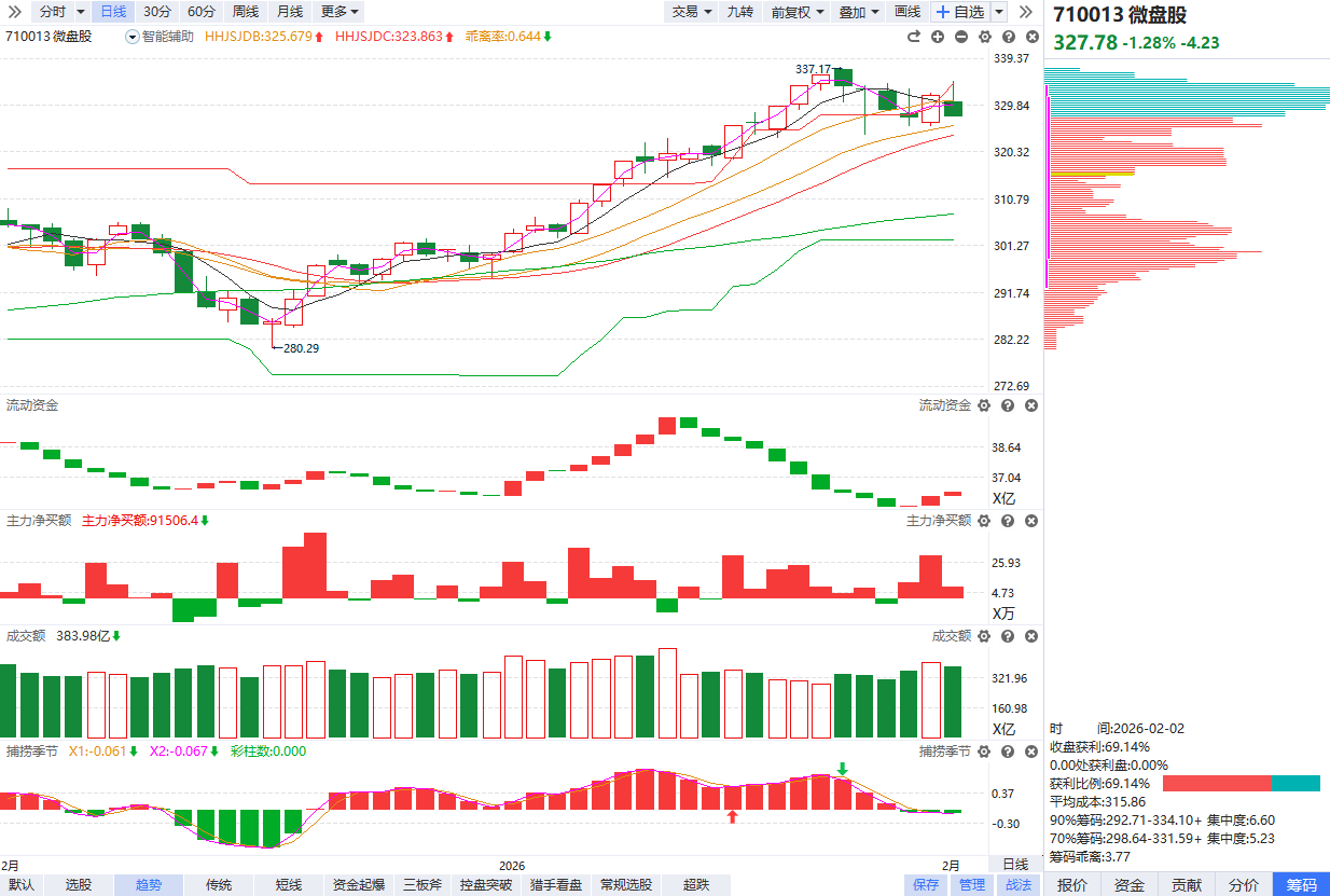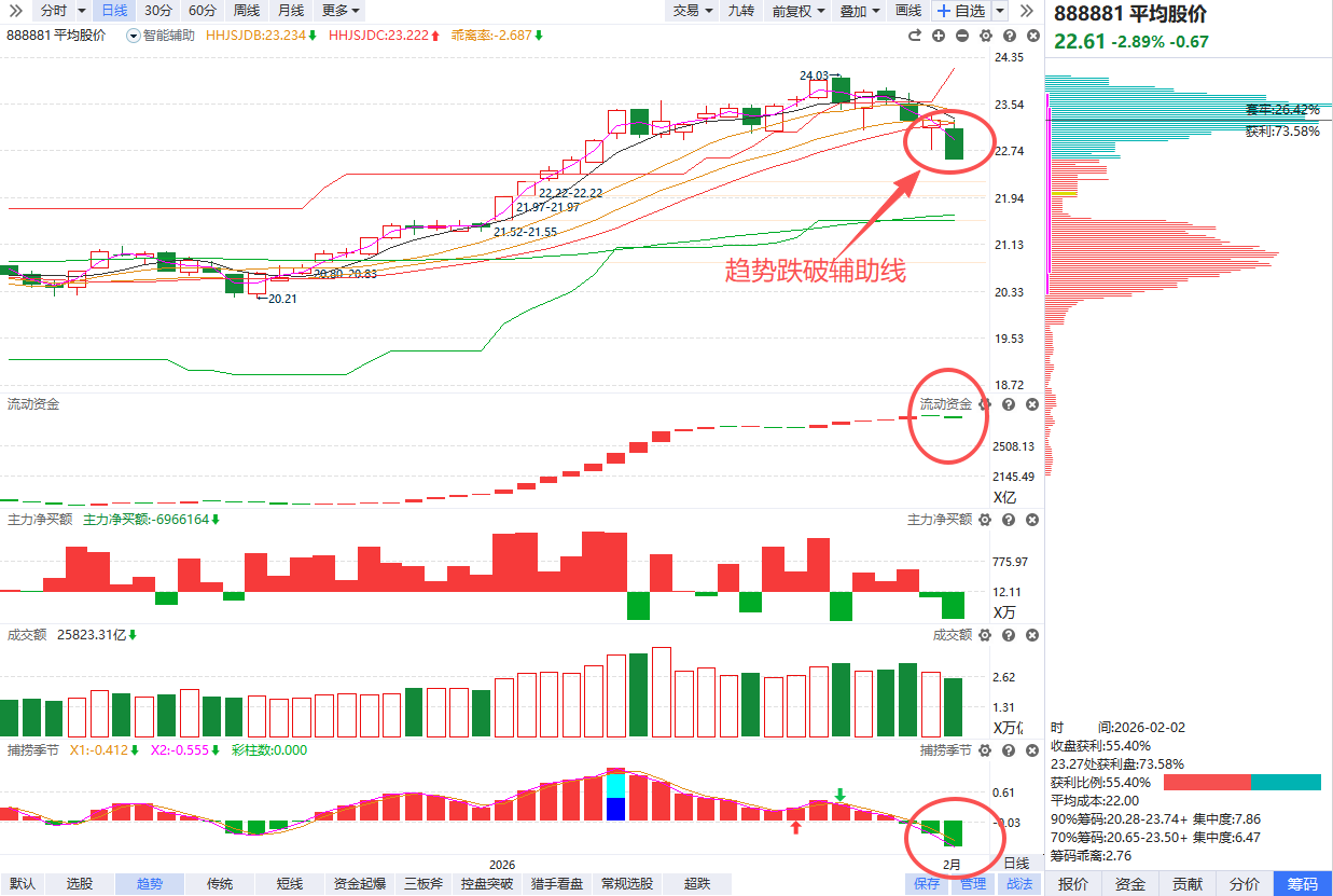 指数角度,由于周五晚美股科技股集体调整,周五护指数的大科技,CPO、芯片补跌,导致指数跟随调整,平均股价跌破辅助线,流动资金和主力净买额连续翻绿。资金和趋势走弱,短期适当控制仓位观望防守,等待新的中阳线或长下影线止跌信号出现,再留意新启动的方向。