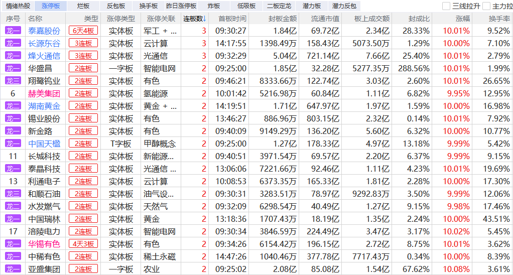 焦点股方面,光纤概念股法尔胜6天5板,华为算力概念股泰嘉股份6天4板,发电机概念股长源东谷7天4板,油运板块招商轮船7天4板,油气板块洲际油气竞价超20亿封单一字涨停。涨停梯队来看: