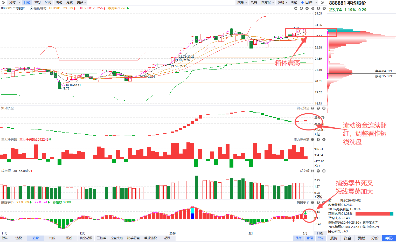 指数角度,平均股价出现死叉信号,短线波动加大,短期注意回避高位追涨,适当收缩仓位防守。不过目前流动资金连续翻红,市场流动性逐渐回升,资金活跃的调整更倾向于看作短线洗盘,死叉震荡3-4个交易日后如能在辅助线上方出现回档金叉,仍然可以积极看多。