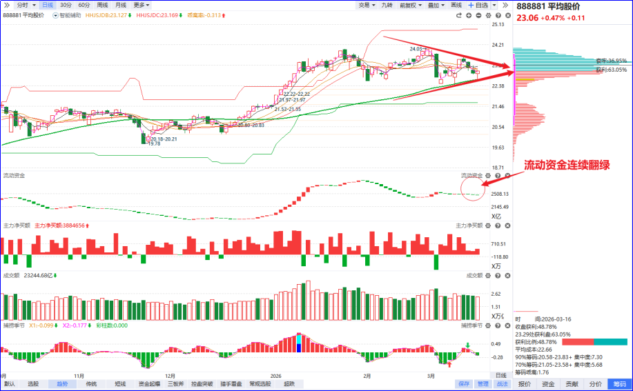 指数方面,平均股价死叉震荡,盘中探底回升,但日内没有放量,流动资金连续翻绿,反弹质量相对一般,后续以控仓观望为主,等待市场选择方向或量能持续放大。