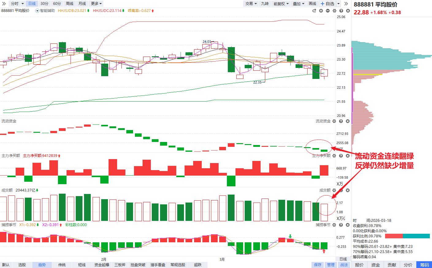 指数方面,熟悉的量化抢高开,然后熟悉的高开低走,盘中一度跌绿再创新低,还好午后阿里消息刺激数据港等直线拉涨配合存储、CPO等发力,才又把指数拉红。但整体来看流动资金连续翻绿,没多少资金跟随进场,更多资金还是对反弹持保留态度。从3月4日到3月9日、3月16日,指数大长腿或恐慌低开反弹后,哪怕抄底指数的反弹持续性越来越弱,但量化仍然会在普跌过后无脑抢竞价压缩反弹空间,所以哪怕是指数修复日,主观资金基本也都不怎么玩了。