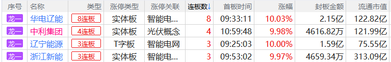 焦点股方面,电力板块华电辽能8连板、华电能源12天7板、韶能股份6天5板,光伏板块中利集团4连板。