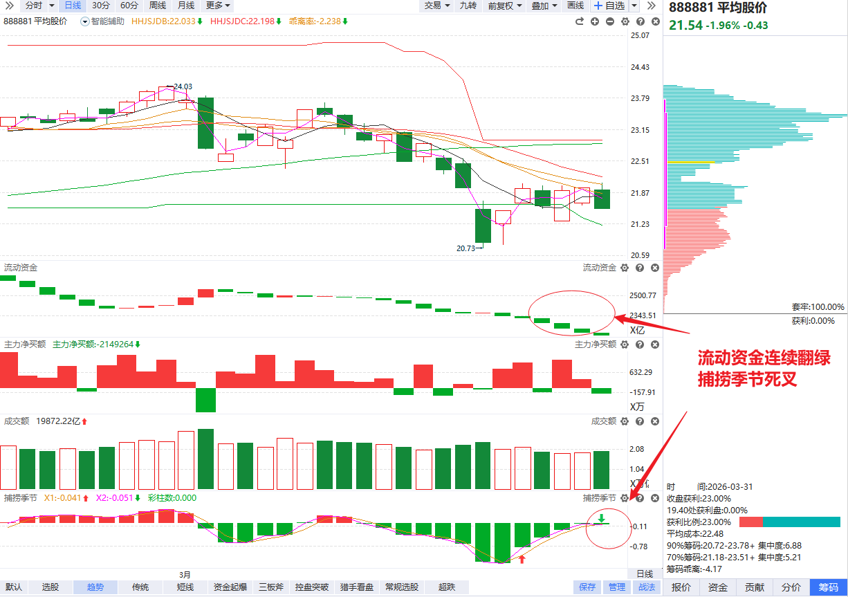 指数方面,昨天也提示了对应的风险,连着两天低开反弹都没有量,显然是不太正常的。如果是像24号、25号这种抢高开的反弹,没有资金进来还算正常,毕竟没有给到性价比场外的资金也不好下手。但是连低开拉起来的反弹都缩量,就说明主观资金的交易欲望仍然非常低迷。今天分歧如期出现,在流动资金连续翻绿的背景下,走出捕捞季节死叉,那么短期仍然需要谨慎一些,有局部反抽也偏向减亏或收缩仓位的节点,耐心等待死叉震荡3-4个交易日后二次回踩确认底部支撑,期间如果有普跌分化的次日明显低开给到量化倒腾的空间,才考虑控仓低吸博弈。