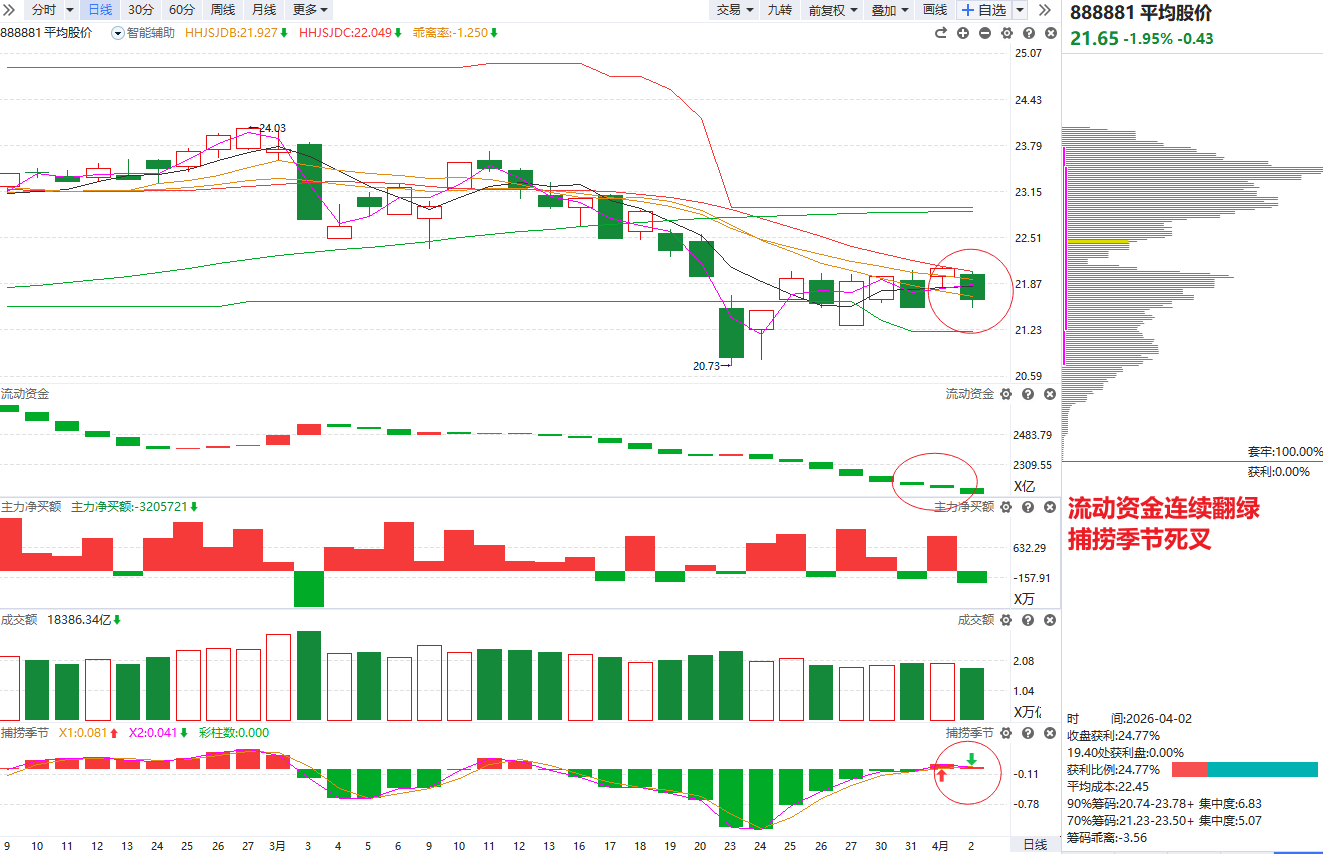 指数方面,平均股价反弹到辅助线附近承压回落,量能依旧低迷,捕捞季节出现死叉分化信号,短线震荡风险加大,需要注意适当收缩仓位。目前平均股价距离辅助线仍然比较近,反弹空间被压缩,后面仍需市场进一步释放空间后再考虑加大仓位博弈(要么向上放量中阳站上辅助线打开空间,要么向下二次回踩熊线支撑)。