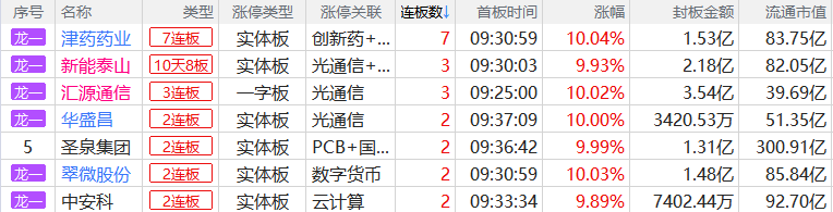 焦点股方面,光纤概念股新能泰山10天8板,医药板块津药药业7连板,算力芯片概念股大胜达14天7板,体育产业链的舒华体育12天6板。