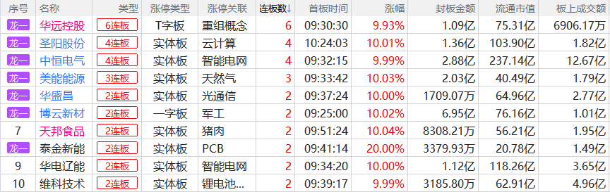 焦点股方面,控股股东重组的华远控股6连板,储能板块圣阳股份4连板、中恒电气4连板,算力租赁概念股中嘉博创5天4板,光通信板块华盛昌7天4板。