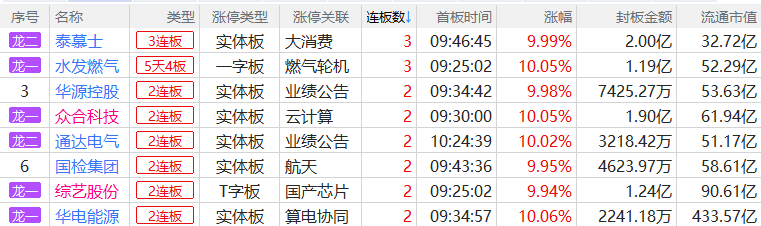 焦点股方面,算力板块盛视科技9天5板,氦气概念股水发燃气5天4板,纺织股泰慕士3连板。