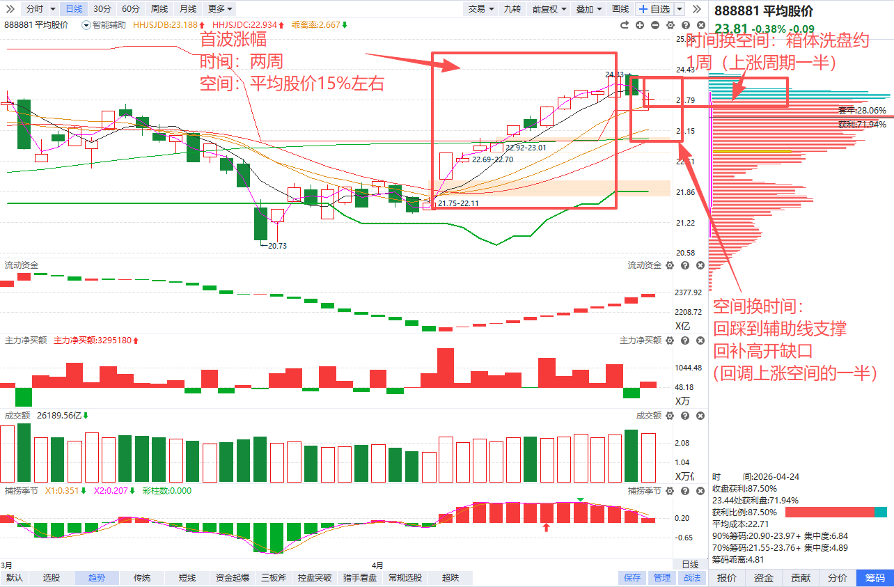 一轮连续上涨后的回调,一般分为两种方式,一是用时间换空间,以周五的下影线为支撑构筑横盘震荡的箱体,通过箱体洗盘清洗浮筹(周期大约为上周波段周期的一半),那么在熊线走平洗盘1周左右以后,如能再次出现熊线上移+资金翻红的回档金叉,就有望形成新一轮趋势启动;二是用空间换时间,跌破周五下影线的支撑,短期快速回补4月14日的高开缺口支撑,通过回补缺口快速释放恐慌情绪形成筹码换手,然后再逐渐回档修复形成二次启动。短期整体以观望防守为主,看市场采用哪种洗盘方式,耐心等待新一轮趋势启动。如果有外部消息刺激的反抽阳线,更趋于短期双头结构,反抽新高就趋于兑现节点。