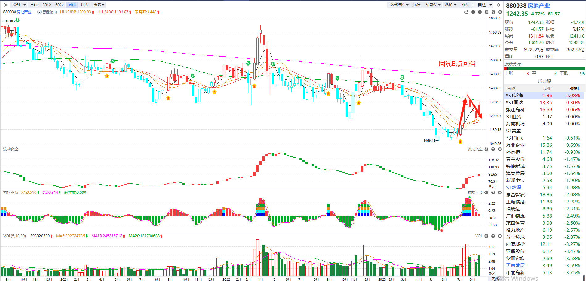 虽然资金提前抢跑规避中报最后一天的披露窗口,导致地产板块集体走弱,但在周线B点回档、资金持续翻红的背景下,政策预期较强的地产板块仍有反核可能。
