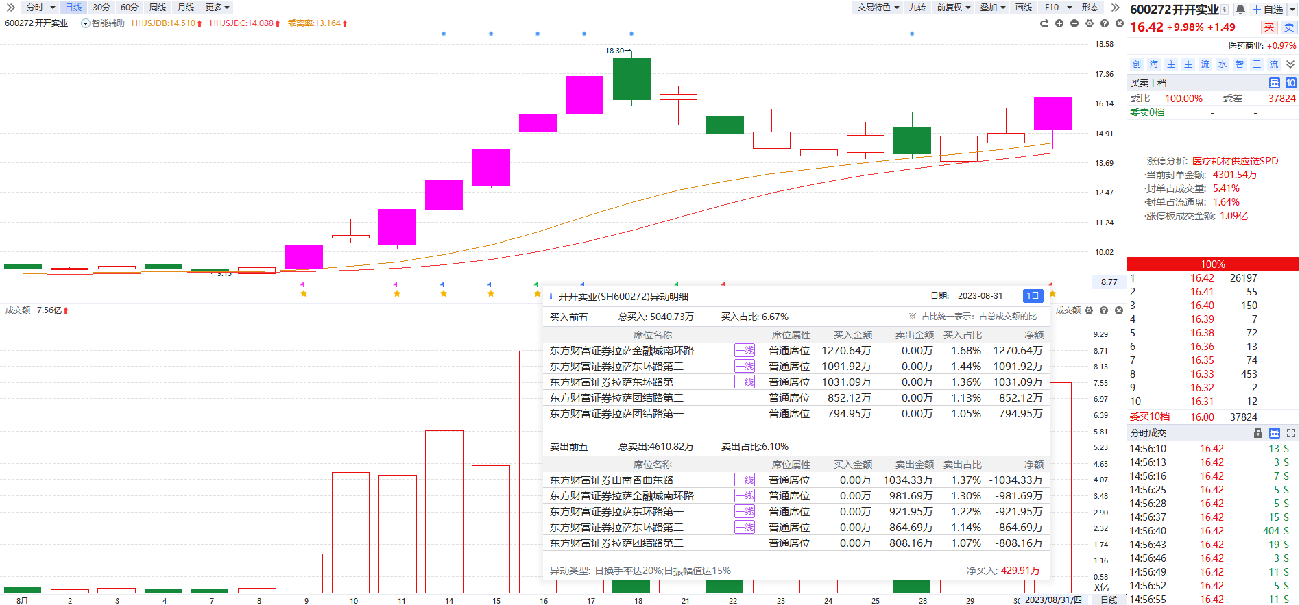 龙头开开实业的龙虎榜上全是东财拉萨的散户,可见虽然医药概念持续调整后出现异动走势,但二波走势中没有强势资金的介入,更多是超跌题材的老龙套利。此外,医药的发酵逻辑也比较单一,还是之前涨过的减肥药和反腐利好的SPD供应链,没有新逻辑催化的二波行情持续性不会太强,可能走个一两天的小波段就结束战斗。