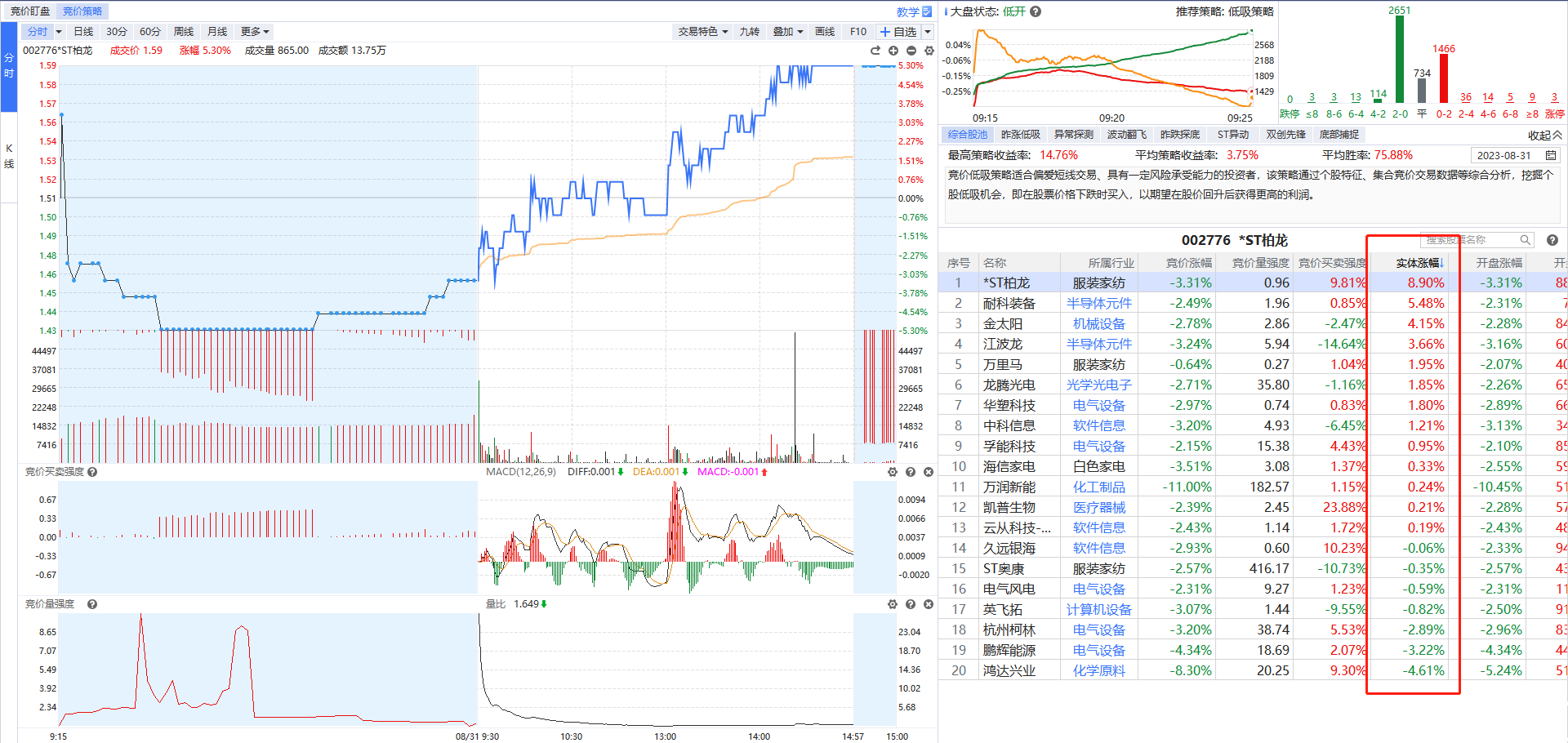 今日竞价捉妖通过综合低吸策略在开盘共选出20只个股,其中13只个股竞价低吸后可实现日内正收益,最大日内浮盈为8.90%,最大日内浮亏仅为-4.60%。对比市场整体表现,今日三大指数均小幅翻绿,两市上涨家数1688家,上涨家数占比仅34.5%,竞价捉妖策略实现日内浮盈的个股占比为65%,大幅跑赢市场(下图中的上市公司仅作为案例展示,不作为个股推荐和买卖建议,历史收益不代表未来收益,股市有风险,投资需谨慎)。