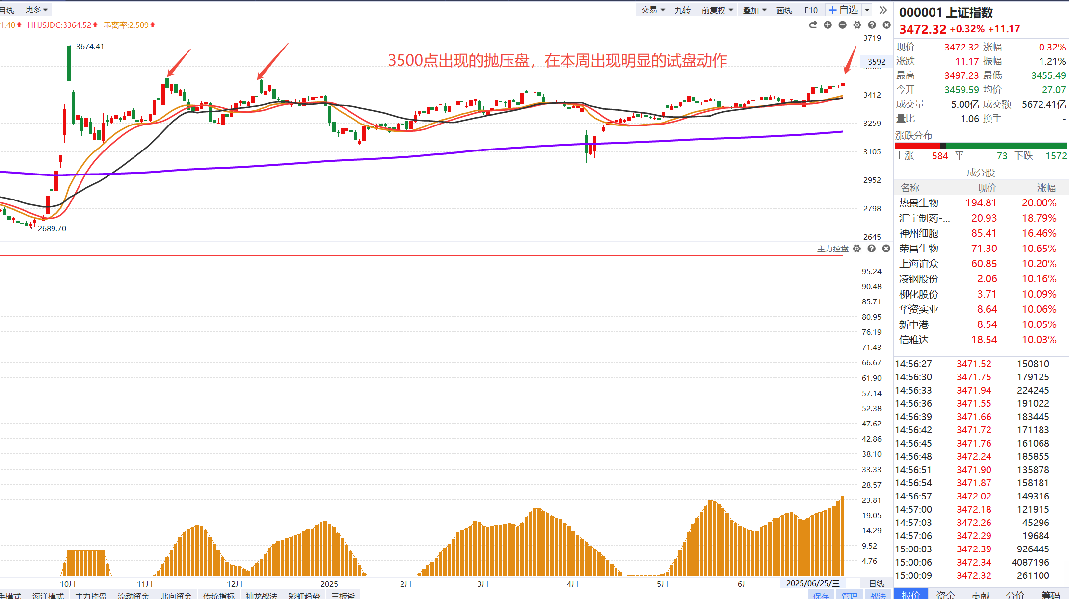 看下市场的情况,因为前期的几次阴线,造成3500点形成了巨大的压力, 指数从4月8号启动到现在位置,呈现出螺旋桨持续向上的走势,并且底部逐步的抬高,整个趋势其实已经形成了慢牛走势,只是没有像去年924行情一样出现成交量急剧的放大而已,周五到压力位出现试盘,后期可能还会继续出现试盘的动作,回踩也好,但对于指数嘛 ,涨一天跌一天的都无所谓,至于哪个位置调整,其实也不重要了,因为你知道调整之后还得向上,大目标趋势已经很确定了,以今年下半年的货币政策和美联储降息的情况,突破新高是必然事件。