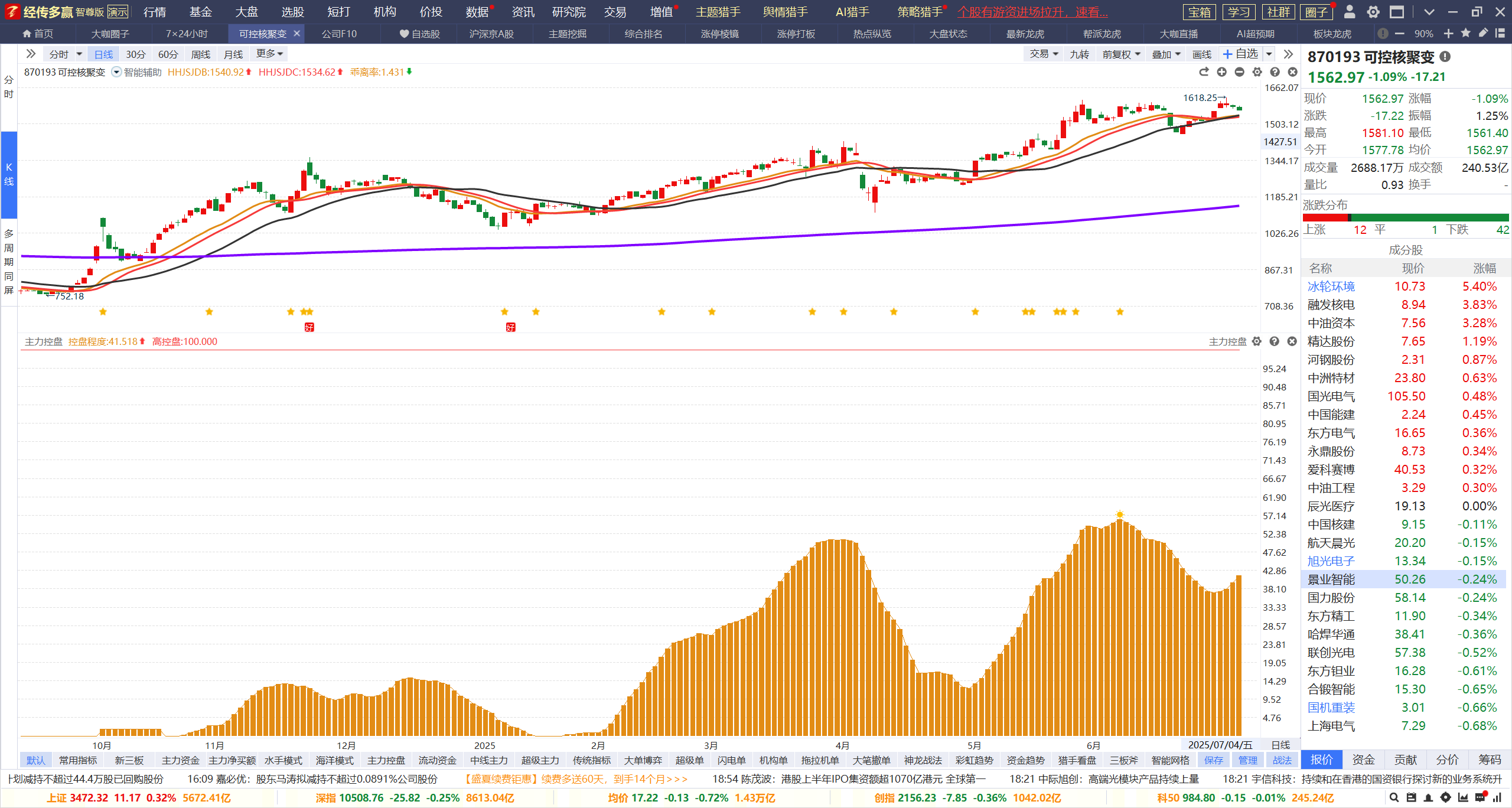 另外可控核聚变,可参考中长线趋势, 现在的走势 大趋势已经形成向上了,对于龙头股,参考业绩好 出席位有控盘的,并且市值在100亿以上的核心龙头