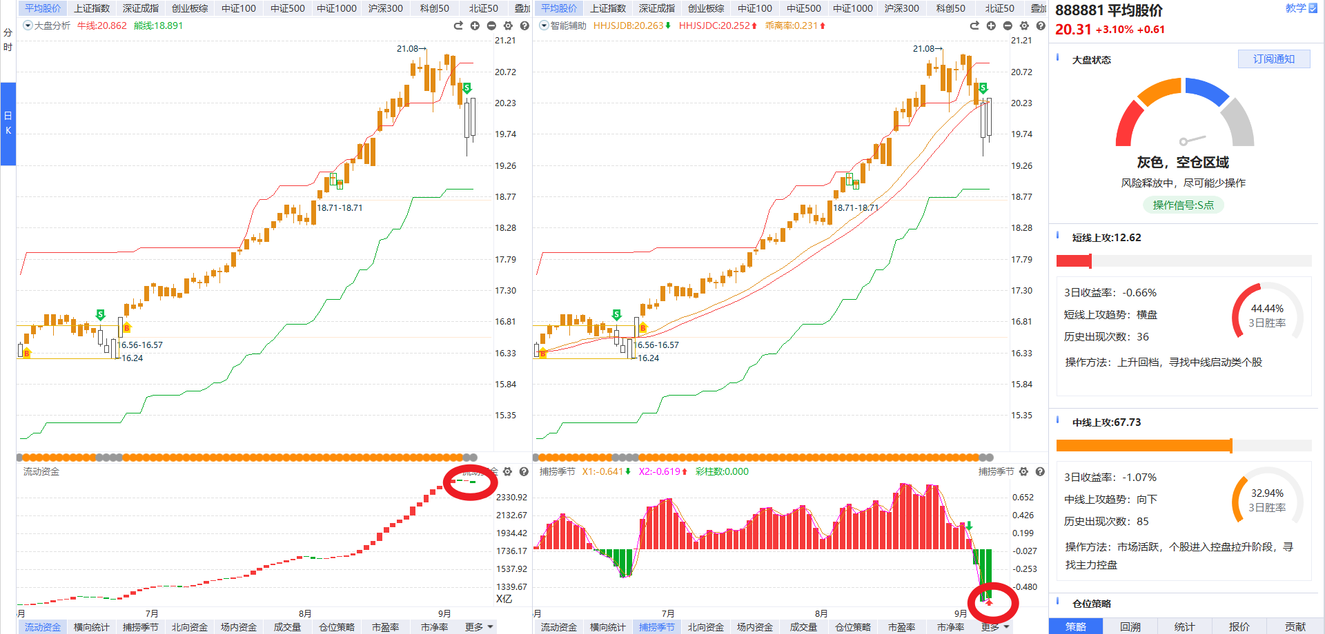 平均股价由B点黄色区域转入S点灰色区域,表明市场整体情绪有所降低,热点呈现高低切换和轮动态势;前期涨幅较大的主题板块逐步退潮,市场量能同步收缩,交投活跃度有所下降。操作上建议整体仓位控制在5成以内,注重防御和灵活应对。