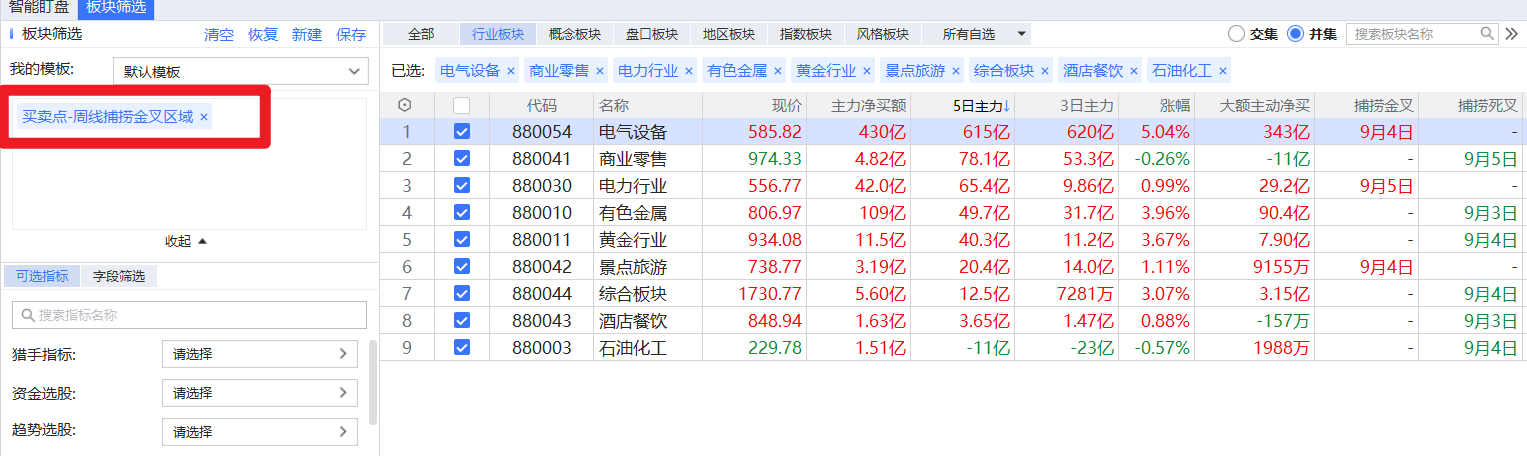 智能盯盘——板块筛选——符合周线捕捞金叉区域,按照5日资金靠前的行业是【电气设备(金叉2日)、商业零食(死叉首日)、电力行业(金叉首日)、有色金属(死叉3天)、黄金行业(死叉2日)】等等,现在大部分行业已经进入周线死叉调整中,留意月线和周线在金叉区域的行业和个股机会。