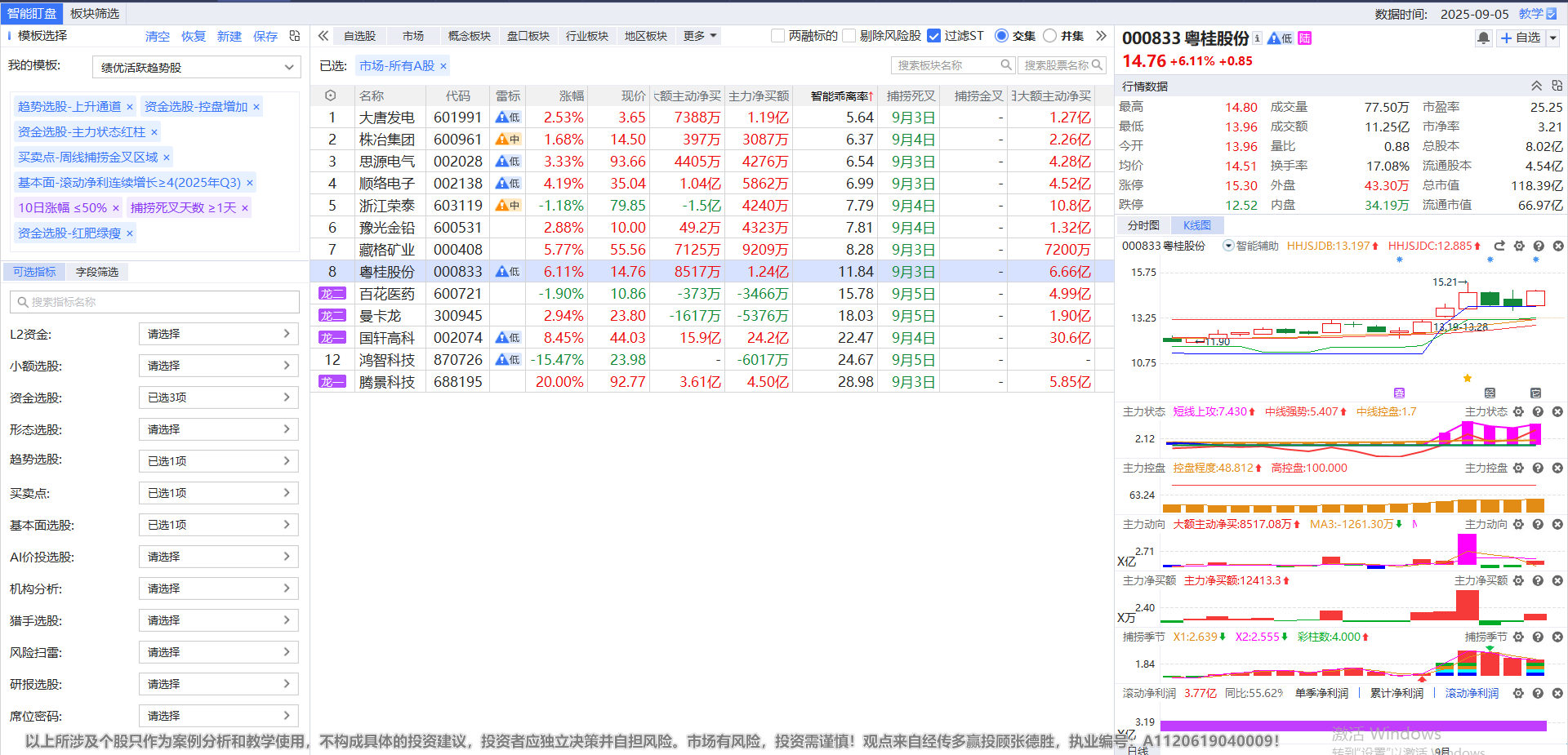 智能盯盘设置:上升通道+控盘增加+主力状态红柱+周线捕捞金叉区域+滚动净利连续增长≥4(2025年Q3)+10日涨幅≤50%+捕捞死叉天数≥1天+红肥绿瘦,优选低位启动或者近期涨幅不高类型个股,符合的有【粤桂股份000833、曼卡龙300945】等。